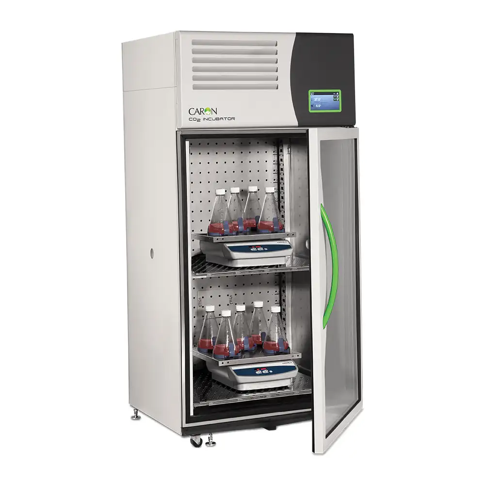 The Caron 7401-25 Shaker-Ready CO2 Incubator combines production-scale 25 cubic foot (708 liter) capacity with reinforced heavy-duty shelving engineered to support up to 500 pounds of orbital shakers, roller bottle systems, and suspension culture equipment. Heavy-duty shelves rated at 150 pounds each accommodate multiple shaker platforms while enhanced refrigeration compensates for heat loads from continuous mechanical agitation. Ideal for CHO cell cultivation, hybridoma production, bacterial fermentation, and mammalian cell bioprocessing with precise temperature (20-60ยฐC), CO2 (ยฑ0.1%), and humidity (ยฑ3% RH) control.